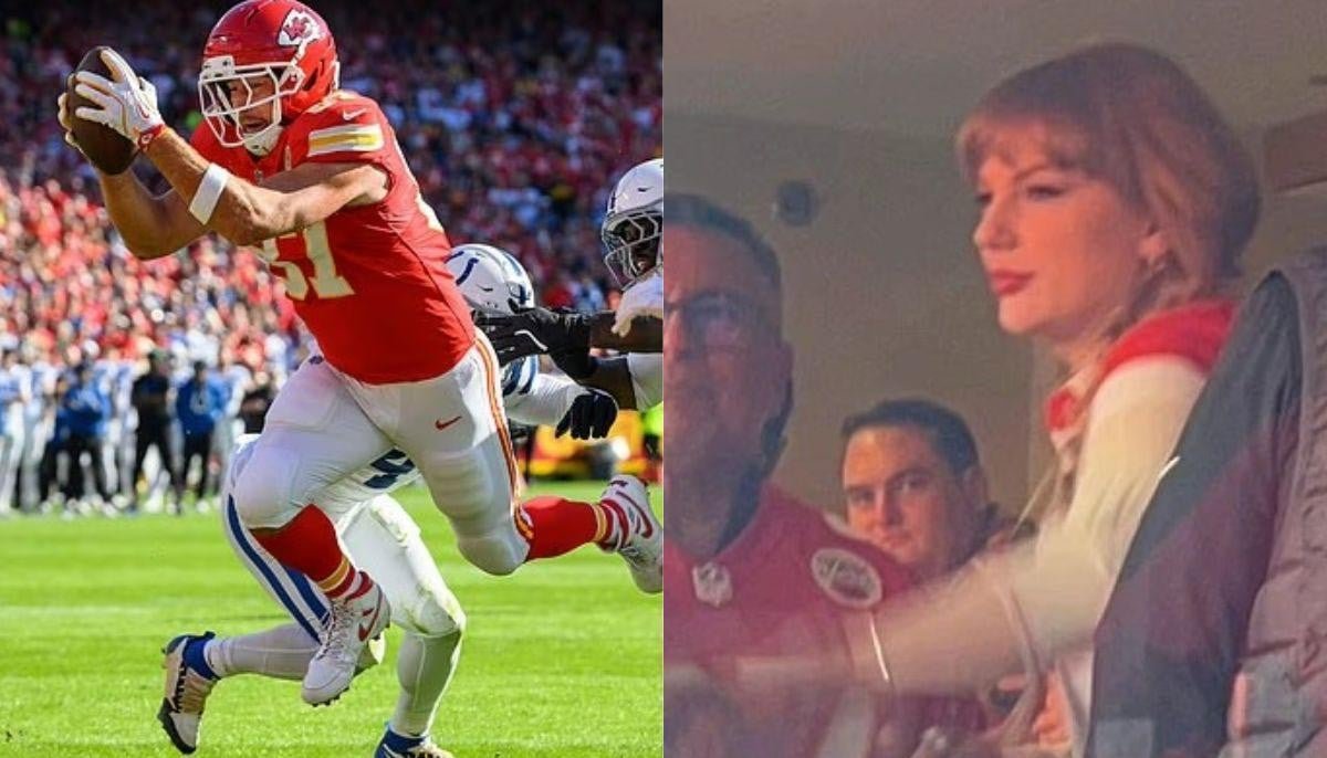 Taylor Swift took time off from wedding planning to cheer on teammate Travis Kelce as the Kansas City Chiefs bounced back from a 23-20 overtime loss against the Colts on Sunday.
